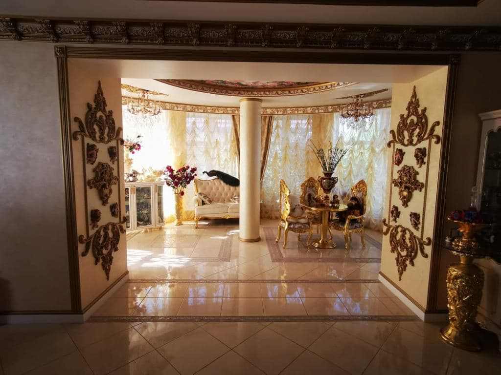 На снимки попал двухэтажный особняк с колоннами и золотыми воротами, а также убранство самого дома. Особняк можно назвать домом-музеем, поскольку в нем есть эксклюзивные атрибуты, скорее всего, подходящие под термины «редкости» и «экспонаты». В комнатах — лепнина и фрески на потолках, резные двери, мраморная лестница с позолоченными перилами и хрустальные люстры. В уборной главы ГИБДД стоит золотой унитаз, душевая кабина с позолоченными дверями и ванна с золотыми смесителями.