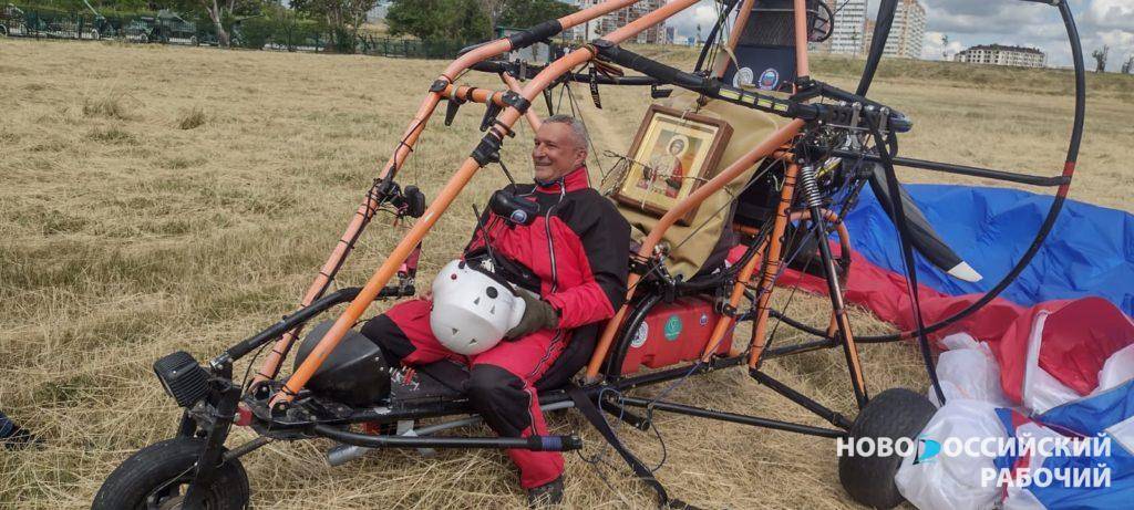 — Когда мы стали снижаться над Новороссийском с высоты 1800 метров, где бушевал довольно порывистый ветер 8-9 м/с, и увидели Цемесскую бухту,- испытали неописуемый восторг, — говорит руководитель экспедиции, член РГО Игорь Потапкин, который, как и обещал, сделал в воздухе над Малой землей на своем паралете три круга с алым флагом.