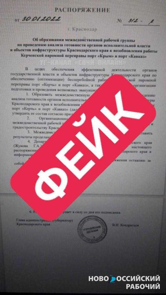 В анонимных телеграм-каналах начала распространяться информация о якобы распоряжении губернатора Краснодарского края от 30 августа по созданию межведомственной группы по работе Керченской паромной переправы для якобы подготовки проведения эвакуационных мероприятий.