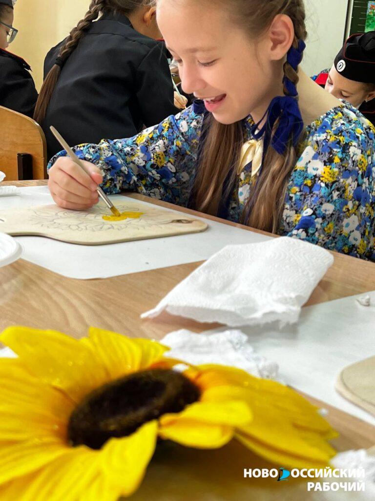 В следующей мастерской работают будущие мастера росписи по дереву. Это очень древнее искусство распространено по всей России и на Кубани тоже. Алина Викторовна Гучанова раскрывает секреты как из простой дощечки сделать произведение искусства.