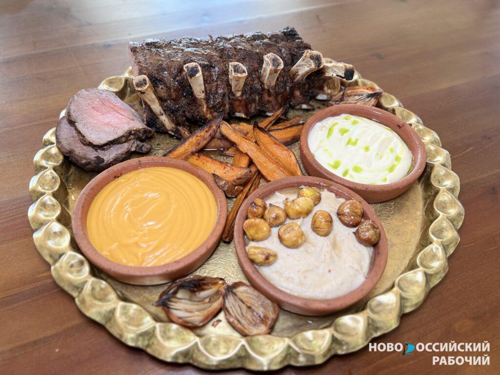 Розовый ростбиф с абраускими травами и гарнирами из каштанов, батата и корня сельдерея