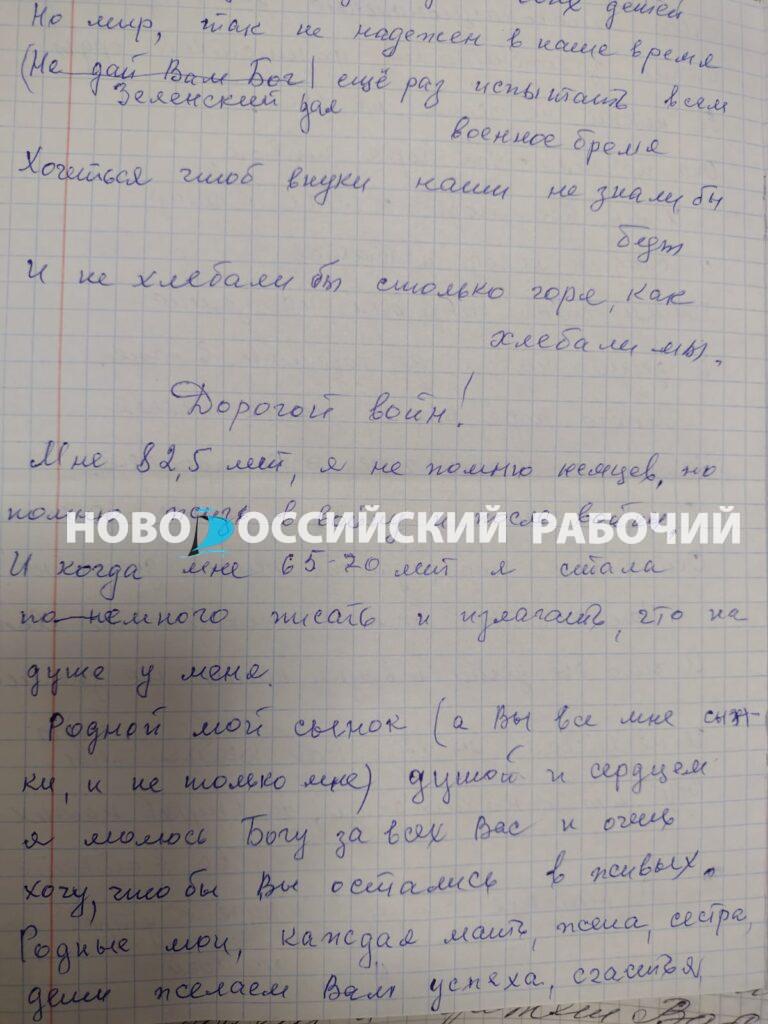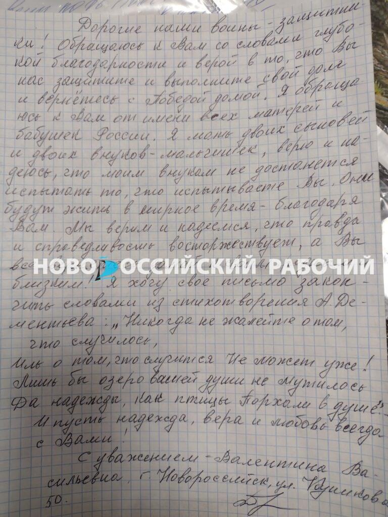 «Дорогой воин! Мне 82 года. Я помню жизнь в Великую Отечественную войну и после войны. Родной мой сыночек, а вы мне все сынки, душой и сердцем я молюсь Богу за всех Вас и очень хочу, чтобы вы остались в живых. Родные мои, каждая мать, жена, сестра, дети желают вам успеха, счастья, радости и долгой жизни на земле. Родные мои! Глупо не рискуйте, помните, мы все вас ждём и молим Бога помогать вам.