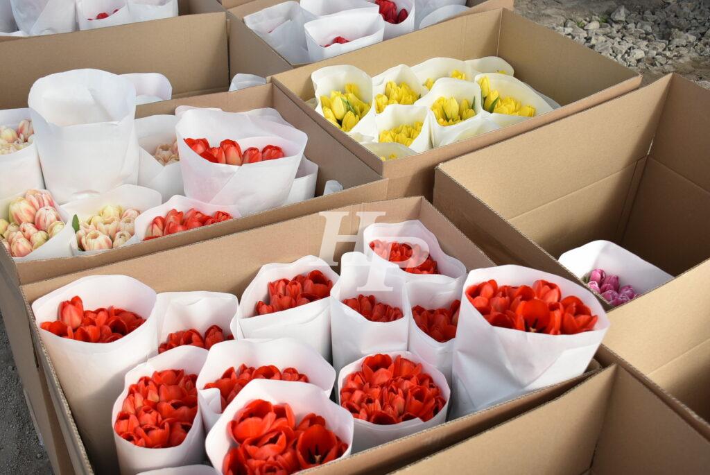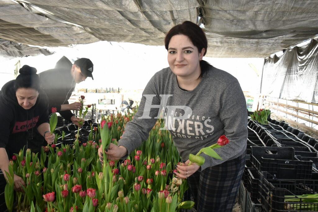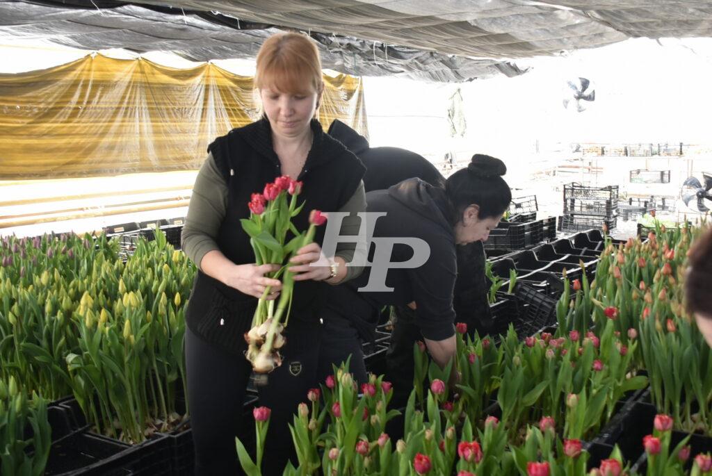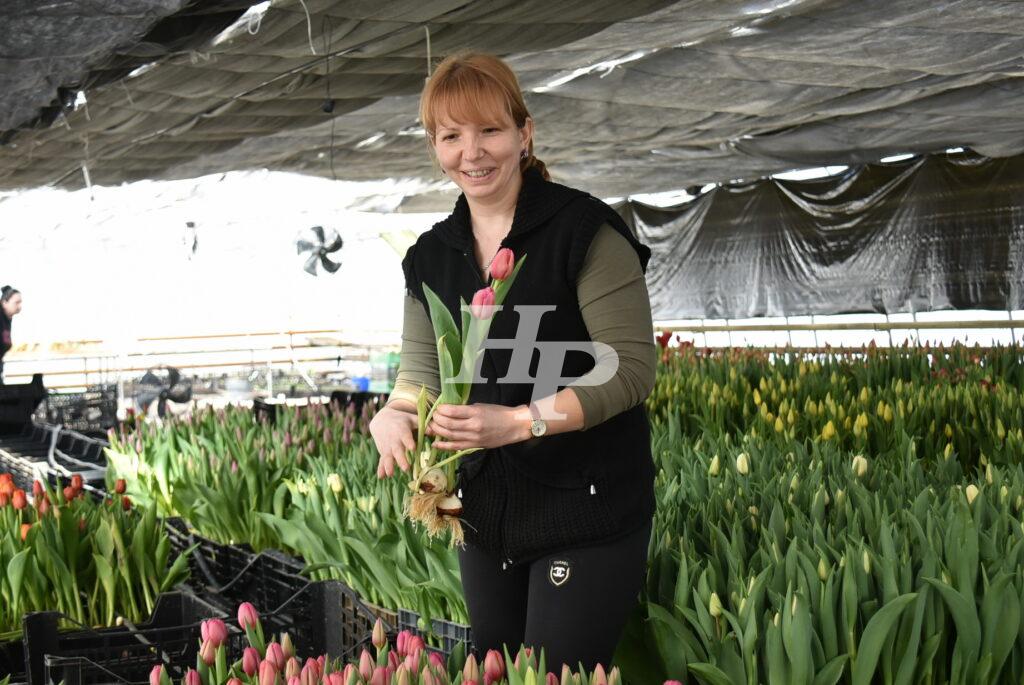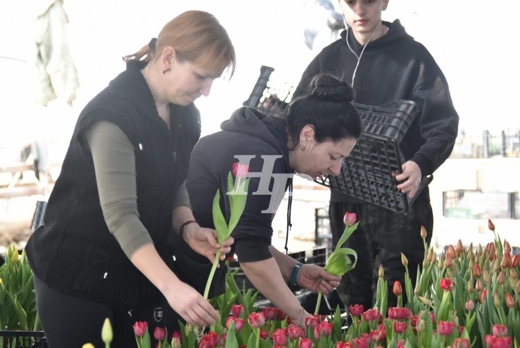 Мы знакомимся с женщинами, работающими в этой теплице. Валерия Мардиросян, мастер растениеводства, вынимает тюльпаны из лотков с водой и собирает в букеты по 15 штук. Их заворачивает в бумагу и закладывает на хранение в холодильник, где держится постоянная температура плюс 1-2 градуса. Вплоть до 7-8 марта цветы буду ждать своего часа в холодильнике.