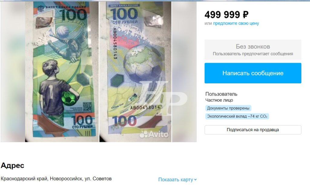 Купюра 100 рублей, вышедшая к чемпионату мира по футболу ФИФА 2018, продается за 1,5 миллиона рублей и за 499 тысяч рублей. На ней изображен ребенок с мячом и известный советский вратарь Лев Яшин.