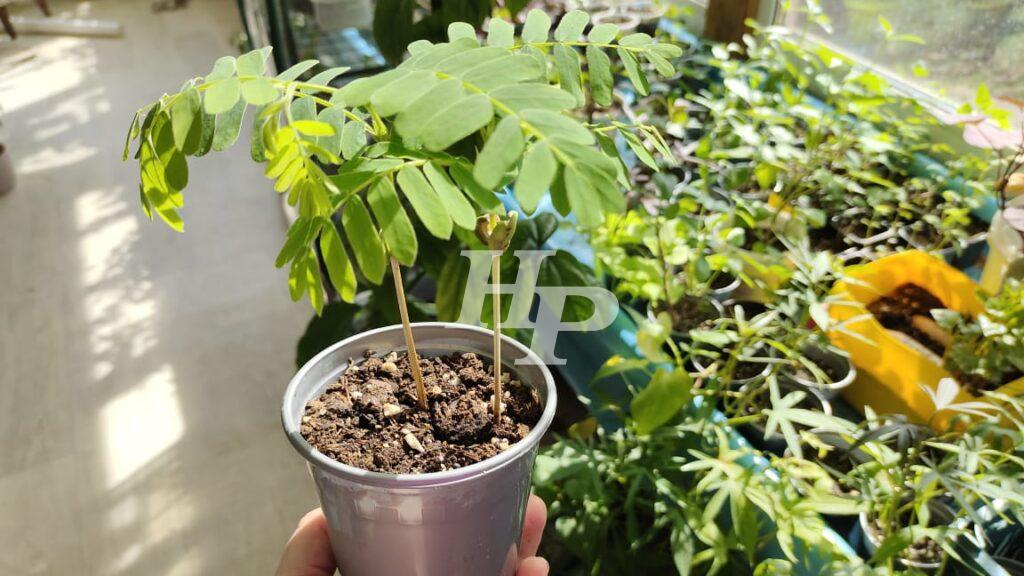 – Это фруктовое дерево, плоды которого похожи на бобы, внутри спрятана мякоть типа инжира или финика, – рассказывает мне Виталий. – Мы его прозвали «вяленой конфетой». Приятель привёз мне сам плод, а мы уже извлекли из него семена. Дерево может вырасти высотой в несколько метров, выглядит довольно красиво, как бонсай. Надеемся в этом году попробовать плоды.