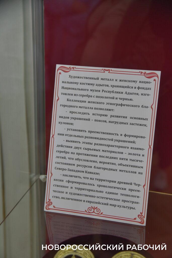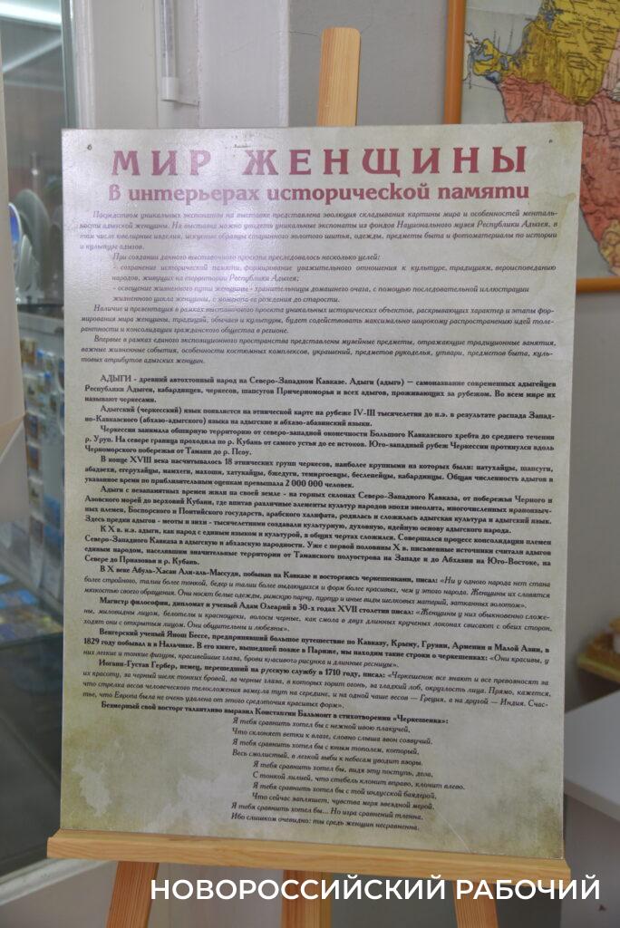 – Очень часто считают, что роль женщины в кавказских семьях принижена, но я вас, возможно, разочарую. Это не так, я расскажу вам всё об особенностях ментальности адыгской женщины, – сообщила, открывая экспозицию, представитель Национального музея Республики Адыгея, научный сотрудник отдела этнографии Саида Мамрукова.