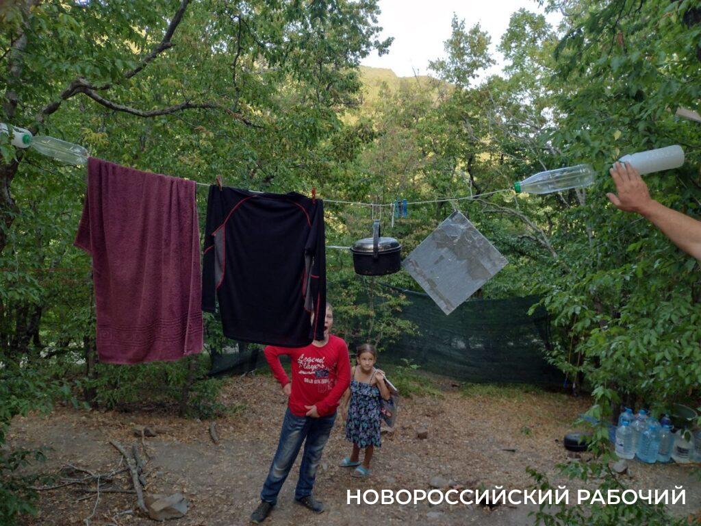 Женщина рассказывает, что приехала с семьей из Подмосковья, родственники поселились в пансионате «Звёздный». А они решили сэкономить семейные деньги, поставили палатку в лесу.