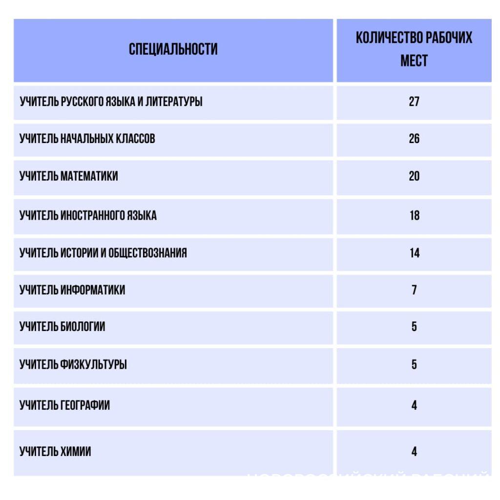 Больше всего в общеобразовательных школах города не хватает учителей русского языка, начальных классов и математики. Практически нет проблем с преподавателями кубановедения – всего одна вакансия. По одной вакансии — учитель-логопед и учитель-дефектолог.
