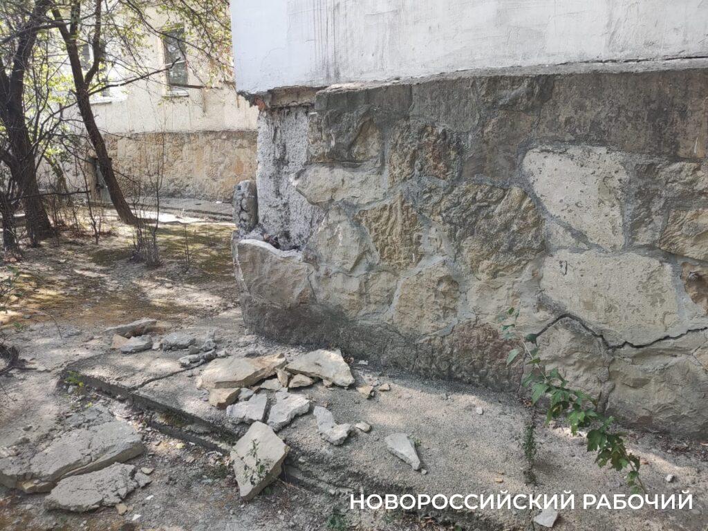 С торца дома хорошо видно, как отходит внушительный слой штукатурки от цокольного этажа. Естественно, обнажённый бетон фундамента как губка впитывает дождевую воду, и в квартирах жильцов становится сыро.