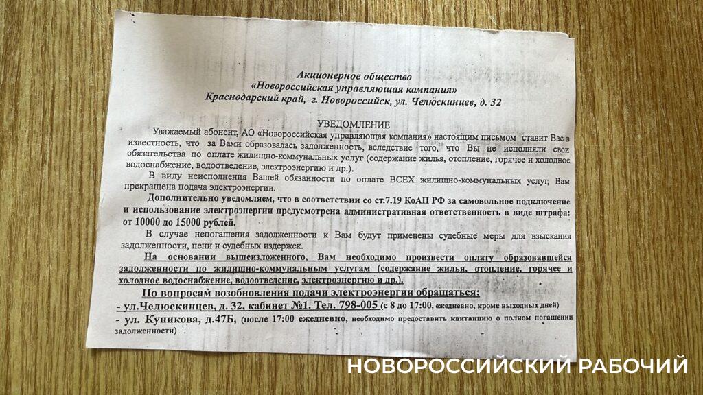 За разъяснением ситуации с отключением света журналист «НР» обратилась в пресс-службу АО «НУК». И получила ответ: «Многоквартирный дом 119 А по улице Видова находится под управлением АО «Новороссийская управляющая компания» с 1 апреля 2023 года. В период с апреля по сентябрь по данному адресу в рамках текущего ремонта МКД были выполнены работы по ремонту кровли, системы холодного водоснабжения, канализации, центрального отопления, электромонтажные работы и др. Всего на 189 637,00 руб. Многие собственники не оплачивают жилищно-коммунальные услуги на протяжении шести месяцев и имеют долги (собираемость составляет всего 32,4 %).