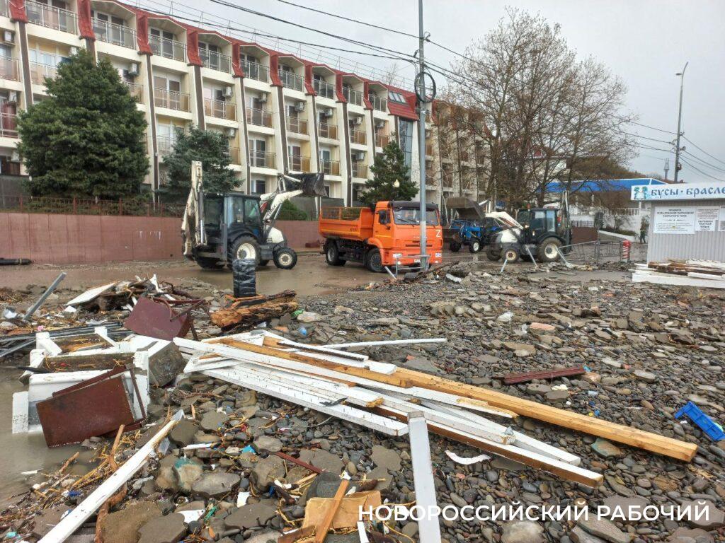На тротуаре и проезжей части куски легких пляжных конструкций, кучи гальки. Гальку грузят на КамАЗы, а они возвращают ее не берег. Много людей заняты расчисткой вручную. Но объем работы просто огромный.