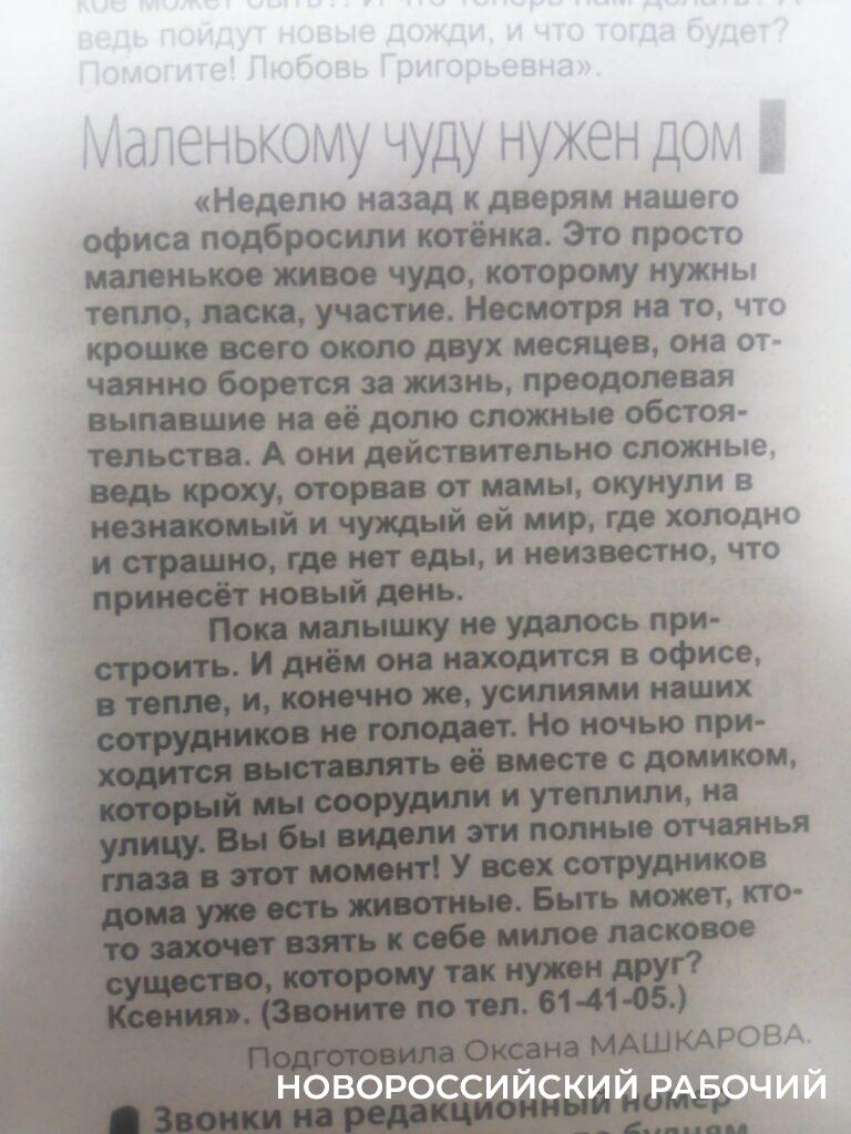 На публикацию в газете откликнулись несколько читателей, в основном, жительниц частного сектора из разных районов города. Но первой была жительница Мефодиевки Валентина Польская. Она пожелала стать приемной матерью Алисе. Редакционный водитель отвез кошечку в ее новый дом.