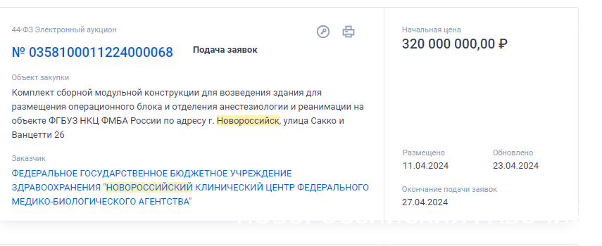 Заявка размещена ФГБУЗ НКЦ ФМБА России, до сих пор это медицинское учреждение многими новороссийцами именуется «больницей моряков».