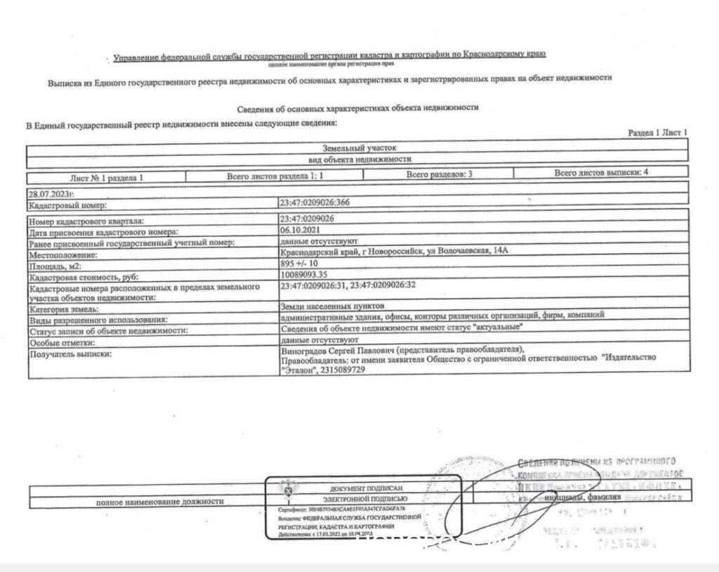 Из выписки из Единого государственного реестра недвижимости, выложенной в соцсетях, можно понять, что речь идет об участке площадью 895 квадратных метров, его назначение – под административные здания, офисы, конторы.