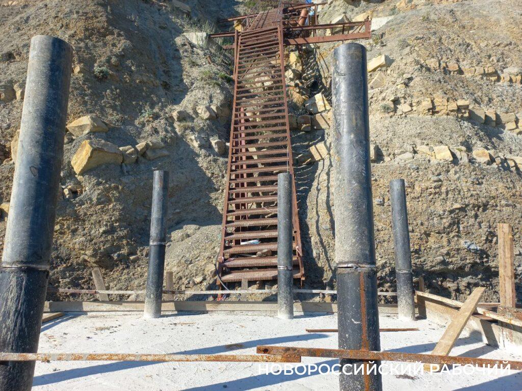 Лестница находится в конце пляжа. Она снова покореженная и поржавевшая. Наверняка, поработал «шторм века». То, что сейчас осталось от сооружения, не вызывает желания взобраться наверх. Старой металлической площадки внизу нет. На ее месте сейчас основательно бетонируют фундамент. Видно, что основой станут бетонные сваи. Успеют ли выполнить все работы к курортному сезону?