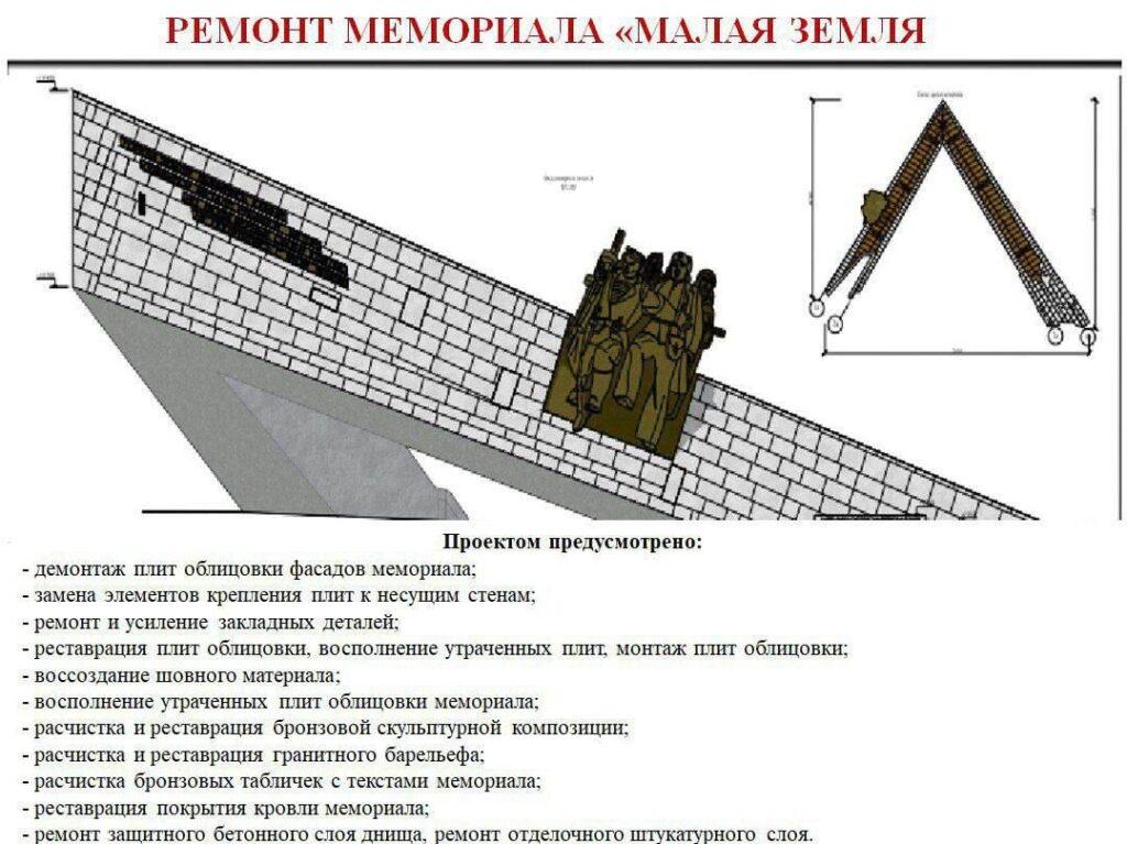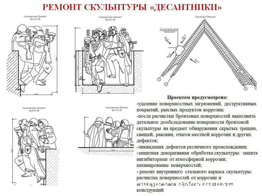 Планируется не просто провести реставрацию плит облицовки, но и большой комплекс работ по укреплению каркаса памятника. При этом мемориал будут реставрировать не только снаружи, но и внутри. Приведут в порядок лестничные марши, стены, перегородки, архитектурные элементы. Основательный ремонт ждет скульптуру «Десантники» на фасаде мемориала. Ее очистят от коррозии, укрепят конструкцию изнутри и обработают защитными ингибиторами, выполнят патинирование.