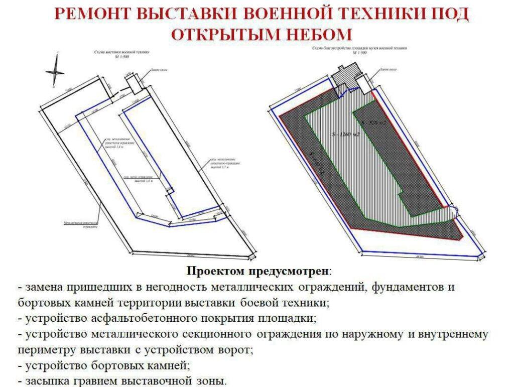 На памятнике «Стела» заменят бетонное основание и облицовку самой стелы, новые гранитные плиты украсят площадку и лестницу у основания памятника. У музея военной техники под открытым небом появится новое металлическое ограждение, площадку музея заасфальтируют.