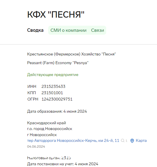 Юридический адрес «Песни» — хутор Семигорский, 24-й километр трассы Новороссийск-Керчь (это район ресторана «Винотеррия»).