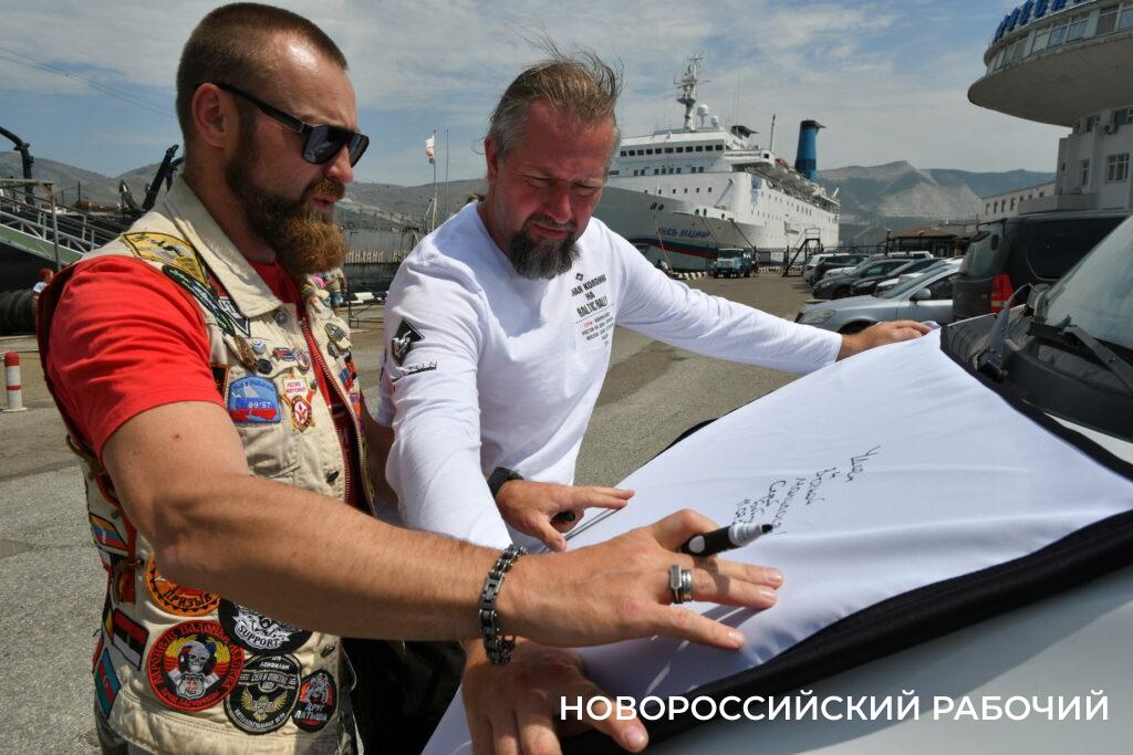 Корреспонденту «НР» удалось взять эксклюзивное интервью у байкеров: участники мотопробега как раз выходили с крейсера «Михаил Кутузов», где были на экскурсии. Здесь же мы заметили известного новороссийского мотопутешественника, члена Русского географического общества Сергея Гвардина. Он гостеприимно встречал мотобратьев на легендарной земле нашего города-героя.