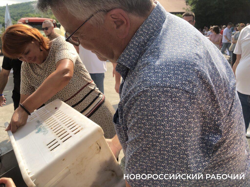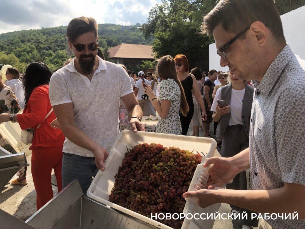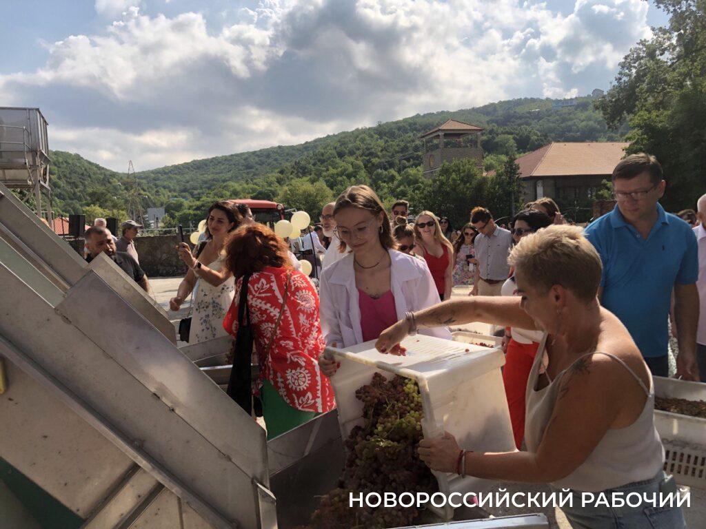 Главное действо праздника – две бутылки игристого правильно взбалтываются и, с двух сторон, Юлия Викторовна Пархоменко и начальник цеха виноматериалов Нальбий Татлок упругой и высокой струей окатывают виноград в ящике! Все кричат ура!