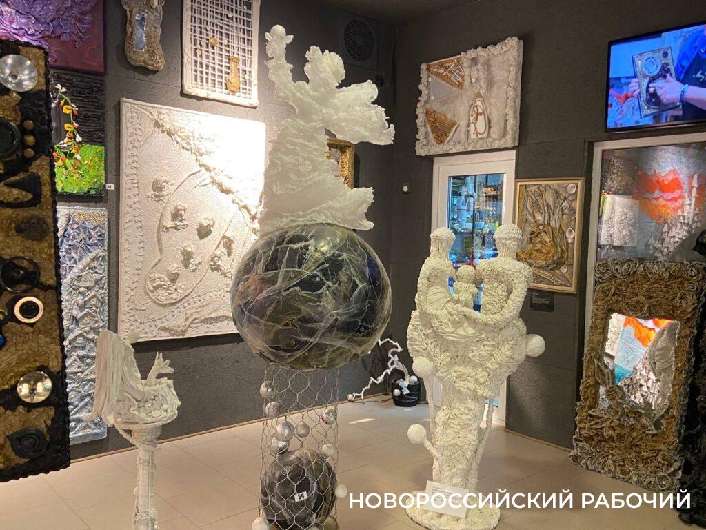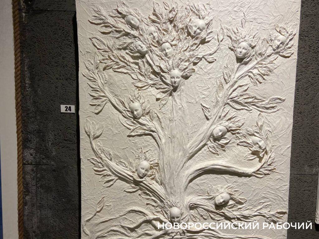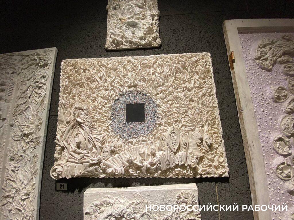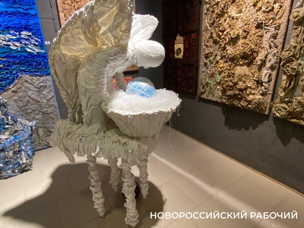Лично меня впечатлила работа, сделанная словно из белого гипса. Но это, конечно, не гипс. Это тоже мусор. Работа — об ангеле нерожденных душ, который опекает их. Сами души тоже представлены на полотне. Работа глубоко философская и заставляет задуматься о многом: например, нашей ответственности за все живое, за реакцию Вселенной за наши деяния, за то, как реагирует природа на хозяйствование человека на планете. Белый цвет нередко присутствует в работах Нины Никифоровой.