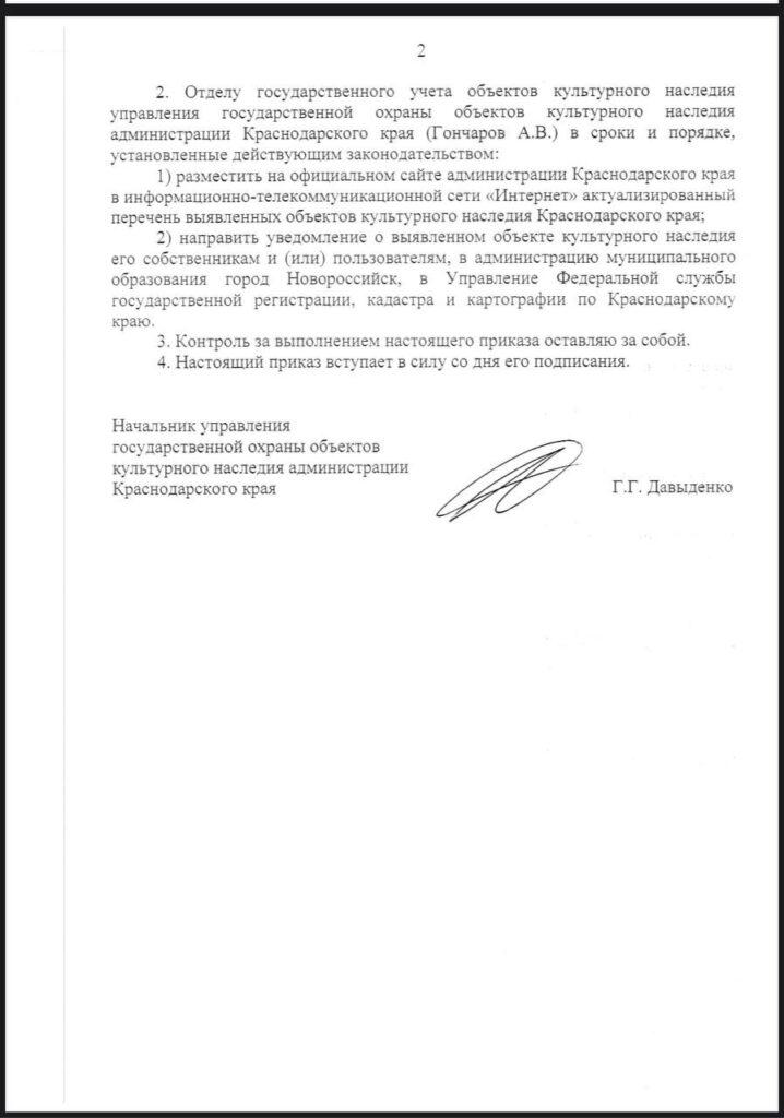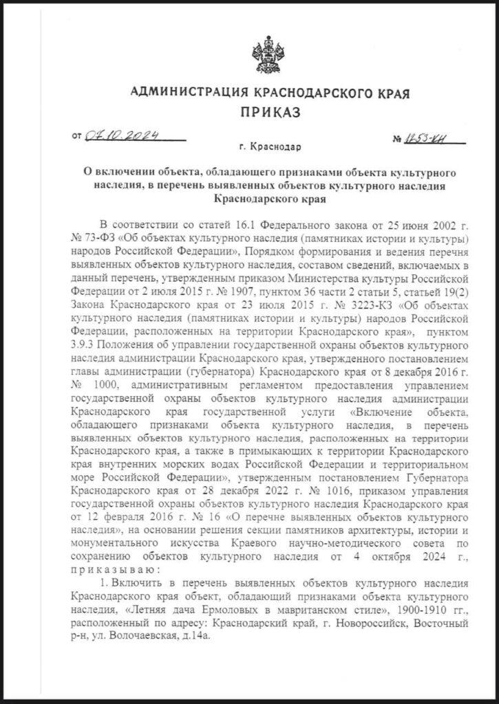 И вот опубликован приказ администрации Краснодарского края за подписью начальника управления государственной охраны объектов культурного наследия Г. Давыденко. Из него ясно, что решением совета включается «в перечень выявленных объектов культурного наследия Краснодарского края объект, обладающий признаками объекта культурного наследия, «Летняя дача Ермоловых в мавританском стиле», 1900 -1910 гг., расположенный по адресу: Краснодарский край, г. Новороссийск, Восточный р-н., ул. Волочаевская, д. 14а.»