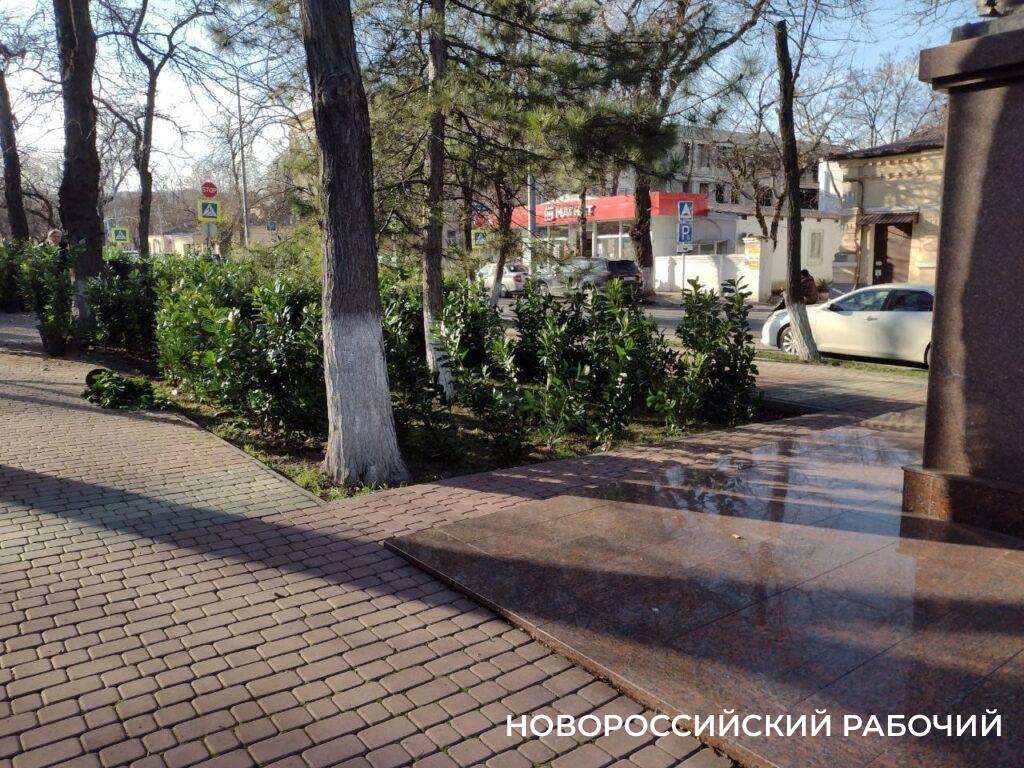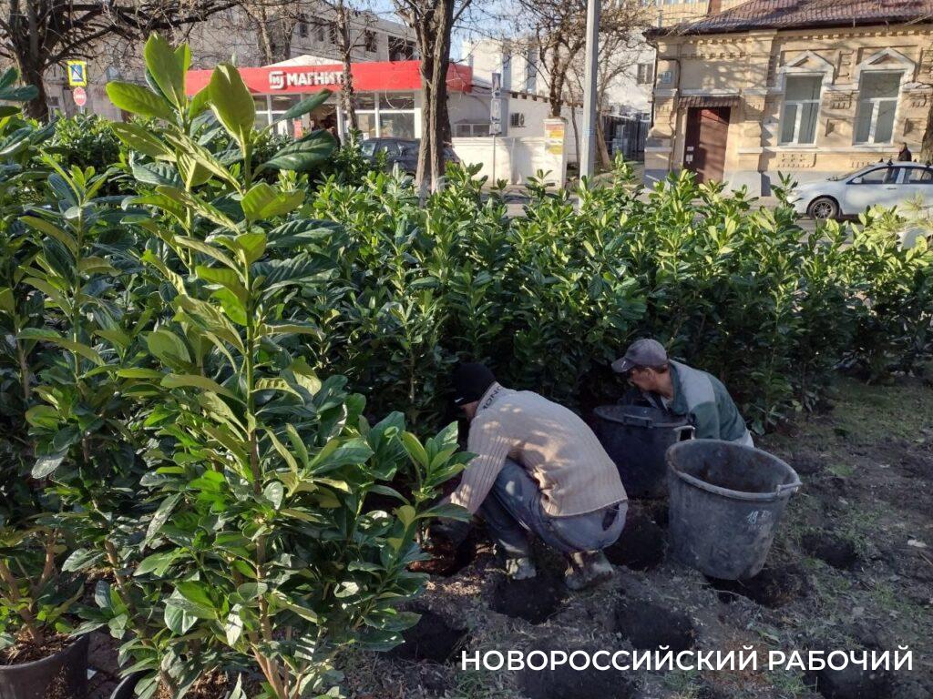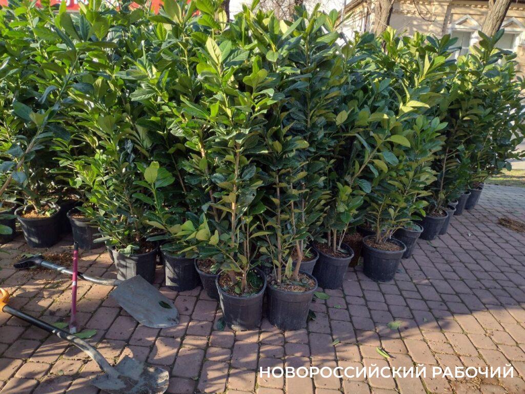 Десятки молодых кустарников высаживают озеленители, как они сказали корреспонденту «Новороссийского рабочего», — выполняя госзаказ. Из контейнеров в грунт сажают лавровишню,