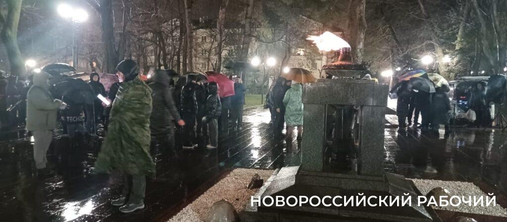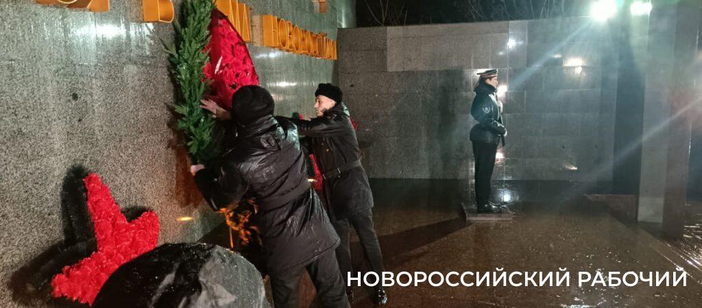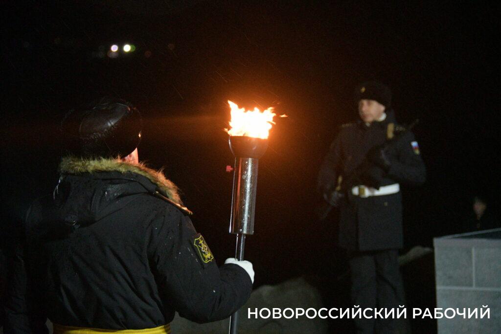 Сегодня ночью на Малой Земле был зажжен огонь воинской славы. По традиции, его зажигают его от факела, доставленного в этот памятный вечер с Площади Героев.