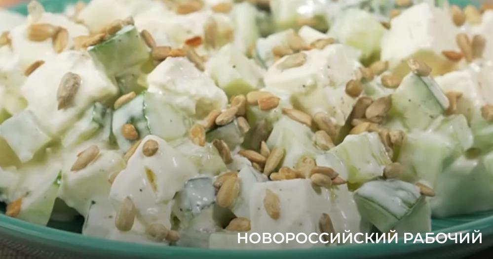 Ингредиенты: очищенные семена подсолнечника — 30 г, большой огурец – 1 шт., сыр фета – 200 г, черный перец по вкусу, майонез — 2 ст. ложки, сметана – 2 ст. ложки.