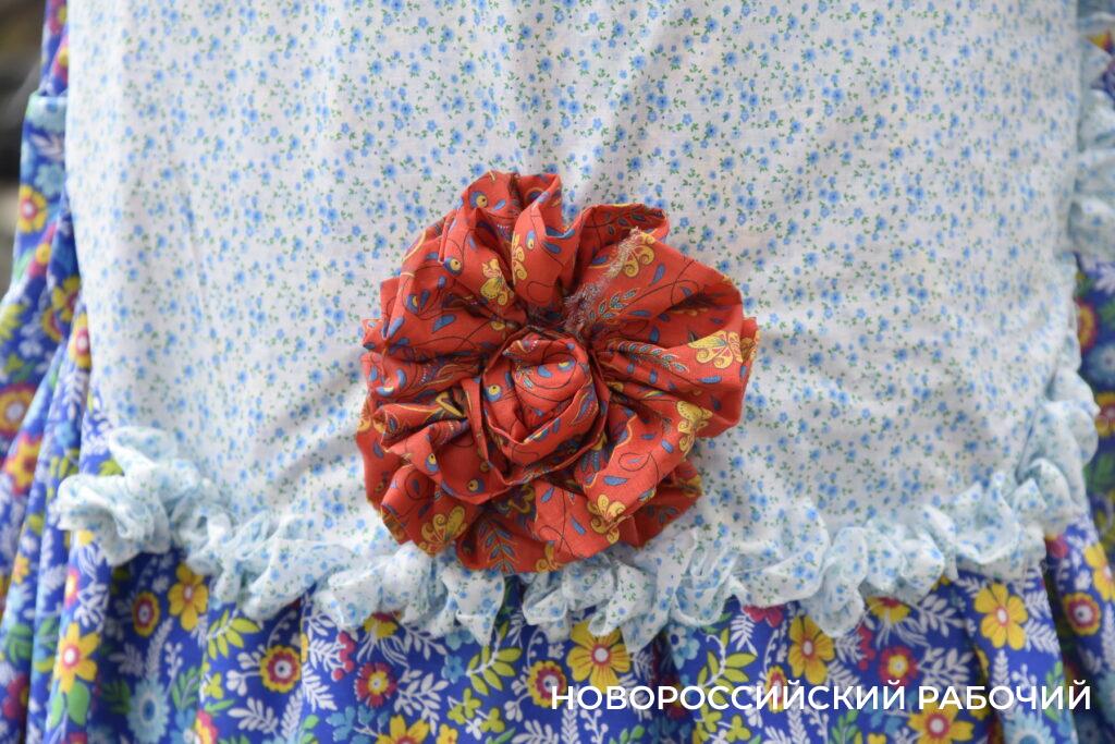 Сине-голубо-оранжево-розовый материал, под советский принт, ландшафтный мастер МАУ «Парки Новороссийска» Дмитрий Авдоненко приобрел в магазине тканей. Говорит, что материал современный, он специально выбирал принт под старину. Чтобы создавалось ощущение, будто ситец из старого бабушкиного сундука. Я помню, что из такой или подобной ткани в 1986 году кроила халат на занятиях по швейному мастерству в УПК на улице Энгельса.
