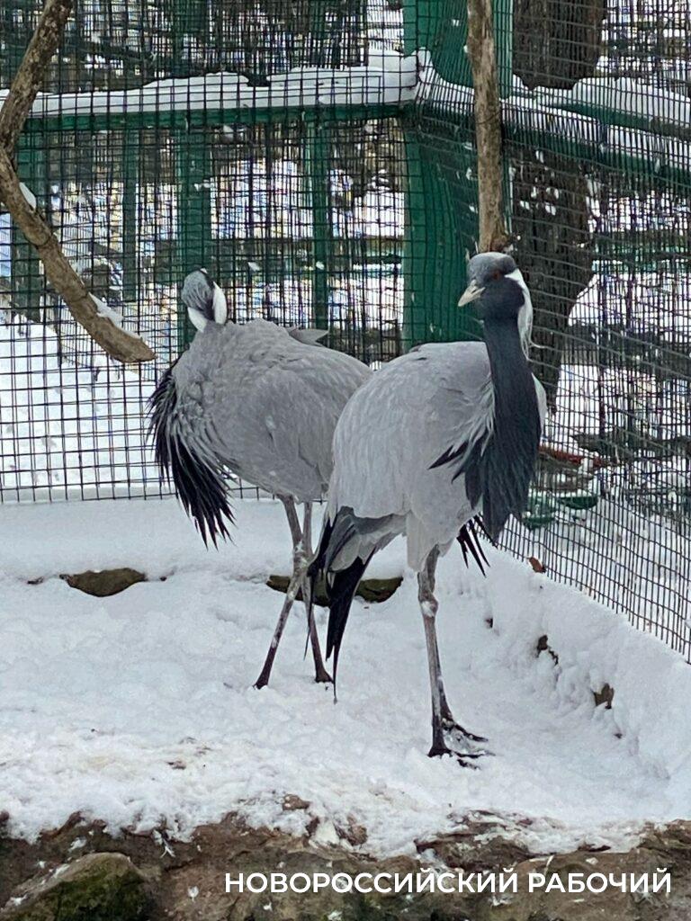 Для водоплавающих птиц в пруду включили компрессор, поэтому в водоеме есть место, где можно поплавать. Журавлям тоже комфортно на снегу.