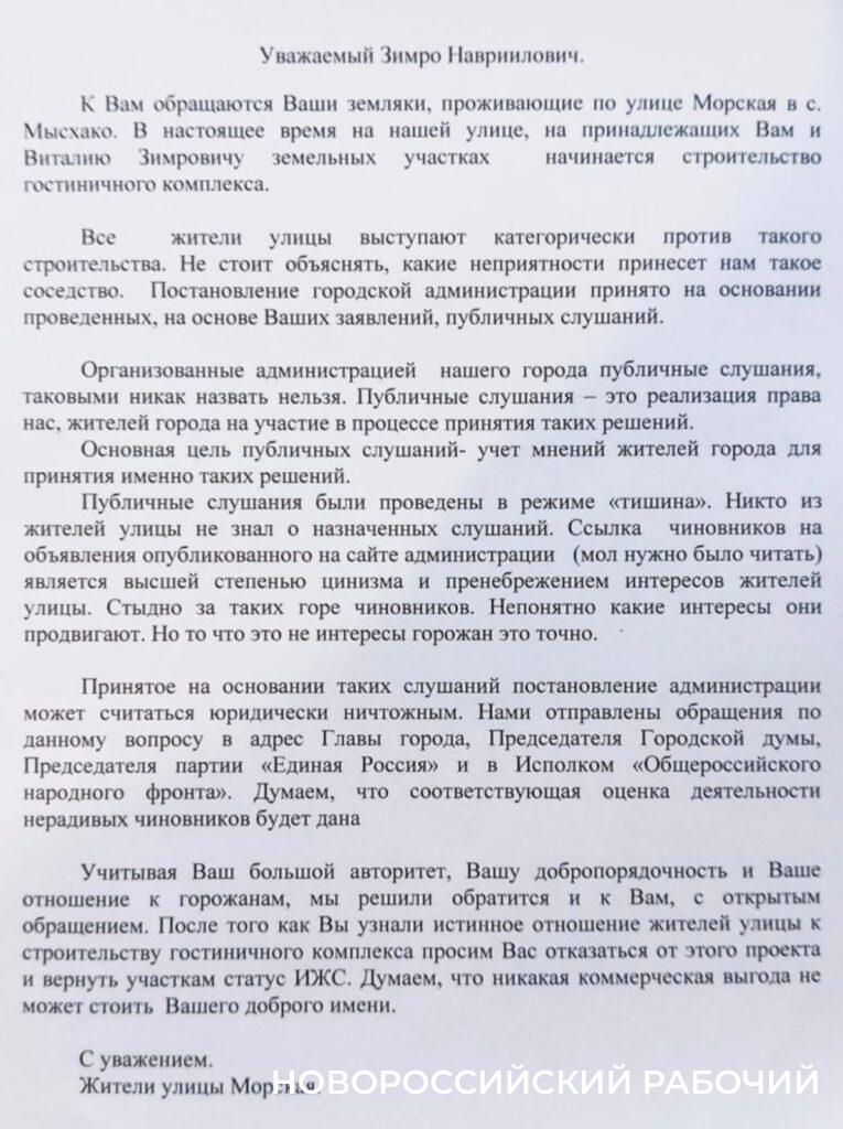 В минувшие выходные жители ул. Морской опубликовали в сельском чате открытое письмо к господину Хананаеву-старшему. Люди надеются, что, узнав их истинное отношение к задумке построить отель, Зимро Навриилович откажется от проекта и вернет участкам статус ИЖС. Прислушается ли бизнесмен к чаяниям людей, покажет время. Что-то редакции подсказывает, что нет, но вдруг мы ошибаемся?