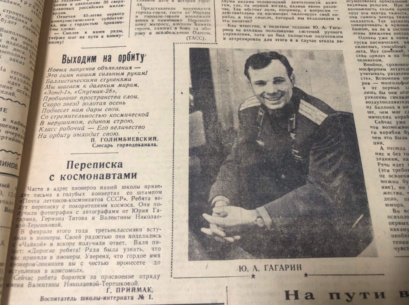 «Часто в адрес пионеров нашей школы приходят письма в голубых конвертах со штампом «Почта летчиков-космонавтов СССР». Ребята ведут переписку с покорителями космоса. Они получили фотографии с автографами Юрия Гагарина, Германа Титова и Валентины Николаевой-Терешковой.