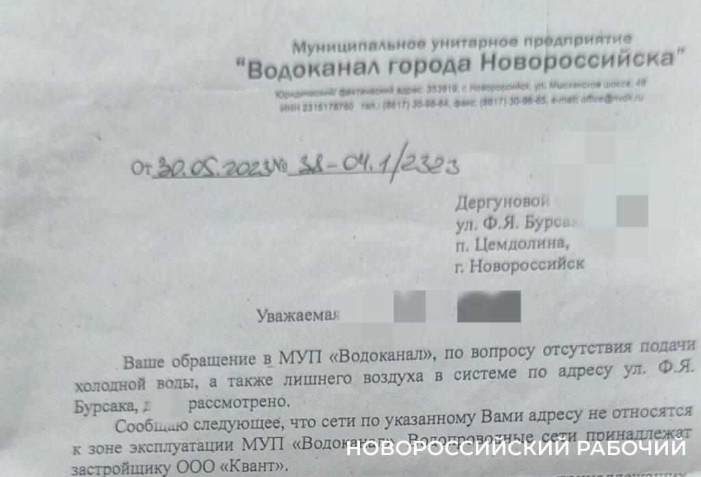 Ответы госпожи Криулиной были предсказуемы: по воде на ул. Ф.Я. Бурсака – обращайтесь к гарантирующему поставщику МУП «Водоканал». Со стороны ООО СЗ «Квант» обязательства выполнены в полном объеме.