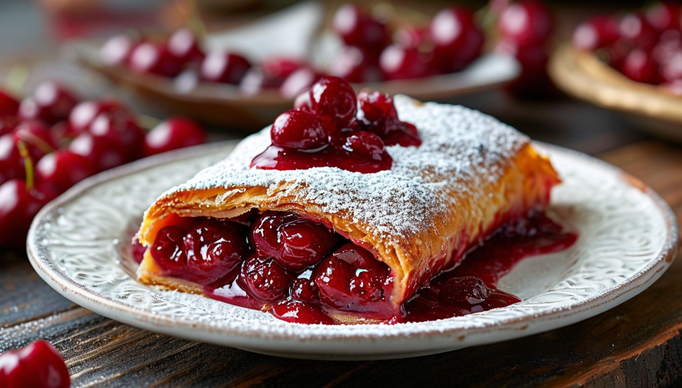 Ингредиенты: вода — 110 мл, куриное яйцо — 2 шт., мука пшеничная — 260 г, соль — 0,5 ч. л., масло подсолнечное — 2 ст. л. Начинка: вишня — 600 г (можно замороженную), сахар — 100 г, вода — 40 г, крахмал кукурузный — 35 г, вода — 50 мл, орехи грецкие – 80 г.