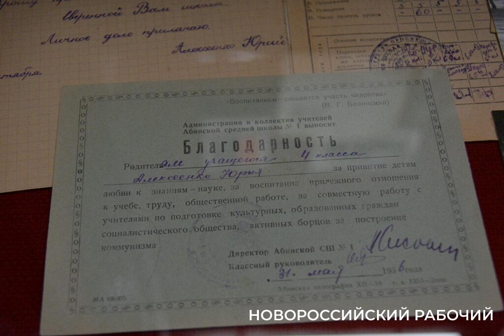 — Строя эту выставку, мы попытались раскрыть две ипостаси Юрия Алексеевича: рассказать о его журналистской работе и литературной деятельности, — поделилась куратор выставки. – А поскольку все мы родом из детства, то здесь есть и вещи Юрия-школьника, их в свое время сберегла мама Юрия, а нам передала его супруга, Ирина Сергеевна. Отец Юрия был известным в городе человеком. В годы войны он приморозил на фронте ноги, был отправлен в тыл, работал сначала военным, а после — прокурором в разных городах Краснодарского края. В Новороссийске трудился с 1957 по 1962 годы. В связи с работой отца семья часто переезжала.
