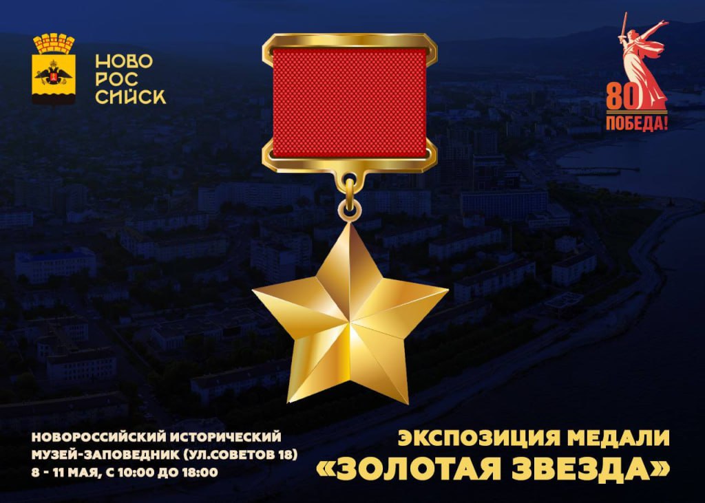 С 8 по 11 мая 2025 года в Новороссийском историческом музее-заповеднике будет представлена медаль «Золотая Звезда» — высшая степень отличия, присвоенная двенадцати городам Советского Союза за героическую оборону в годы Великой Отечественной войны 1941—1945 гг.