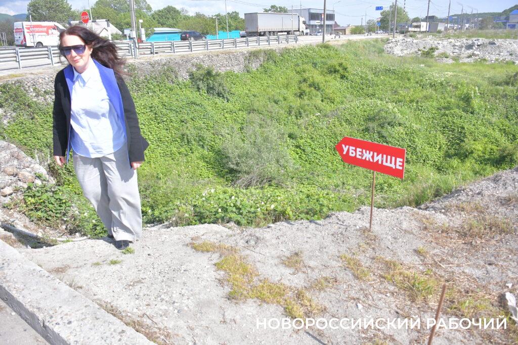 Впервые табличку с надписью «Убежище» я увидела здесь год назад, после атаки Новороссийска дронами 17 мая 2024 года. Она и сегодня на месте. Идем по указателю. В склоне вырезаны ступени и висит массивный канат (как в школьном спортзале), чтобы держаться руками, когда спускаешься.