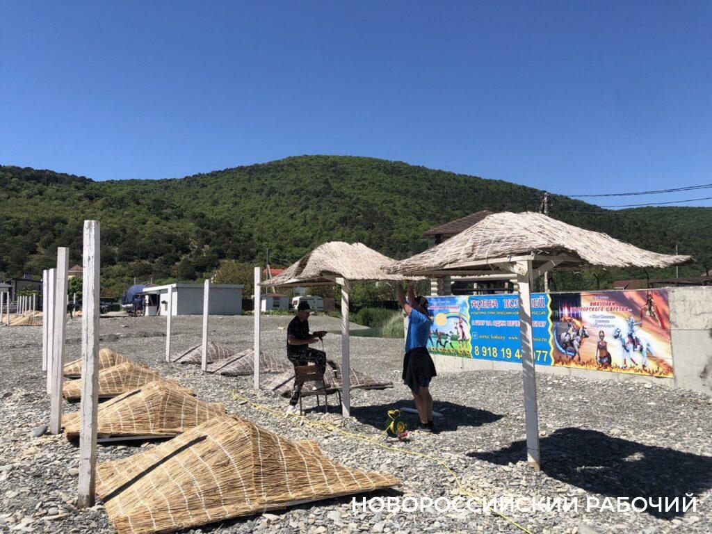 На пляжной территории почти абсолютная тишина. Звуки дрели и перфоратора – рабочие что-то ремонтируют — практически не заметны на фоне шума волн. Как солдаты выстроились столбы теневых зонтов по всей длине пляжа. Их, наверное, больше сотни, и работники один за другим накрывают их плетеными шляпками.
