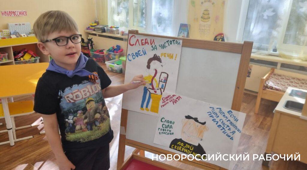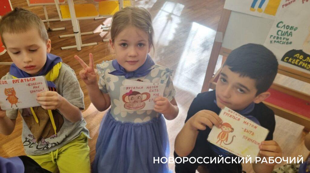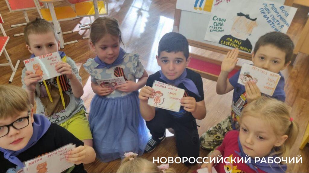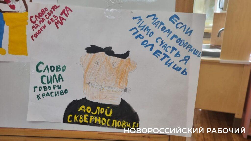 Воспитанники подготовительной группы №1 «Цыплята» первыми в Новороссийске включились в общероссийскую акцию «Россия против сквернословия», придумав рисовать карточки с призывами бросить ругаться и раздавать их прохожим. А еще у них была беседа с воспитателем на тему о вреде мата, и они просмотрели мультик. Куратор проекта, воспитатель сада №81 «Электроник» Ирина Демина говорит, что детки в группе в основном все приличные. Но есть некоторые, позволяющие себе иногда что-нибудь эдакое. Дети, включившиеся в проект, стали им делать замечание и результат не заставил себя ждать.
