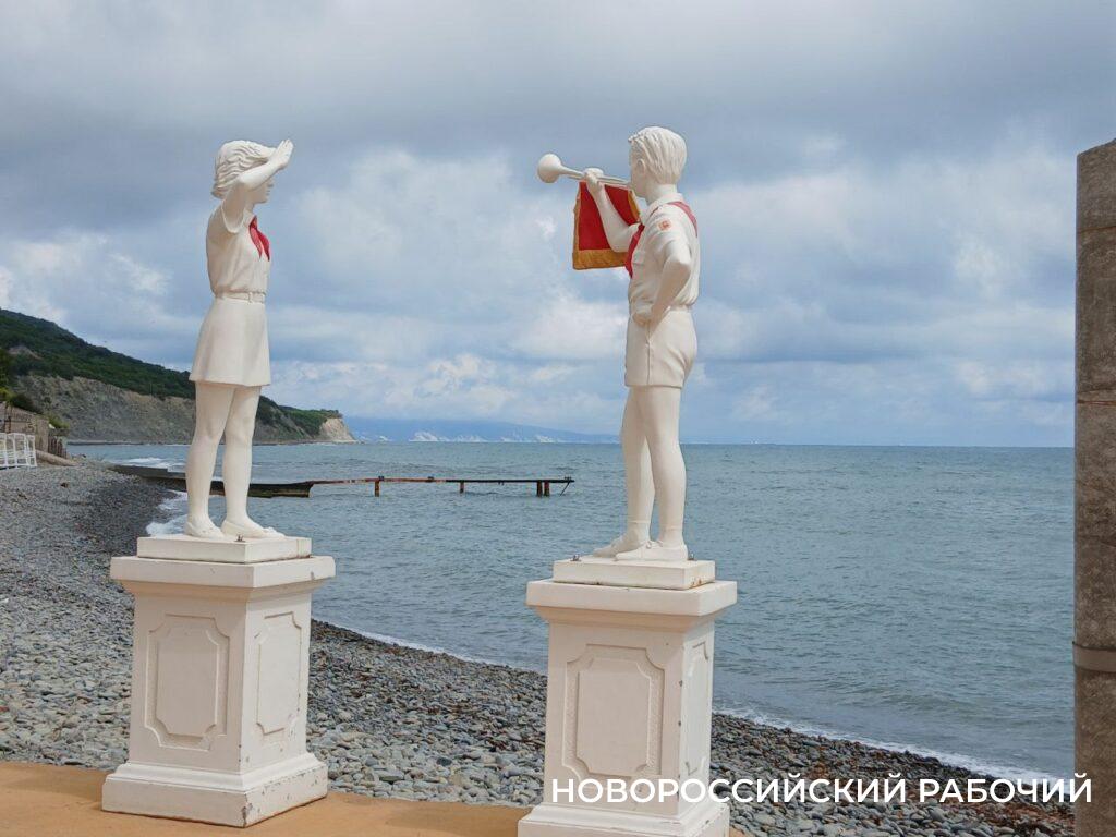И еще одна скульптурная группа, без которой трудно представить этот участок Широкой балки, — это советские пионеры в красных галстуках и с горнами. Эти пионеры всегда появляются на берегу ближе к лету и стоят тут до самых холодов. Как напоминание, что совсем недалеко отсюда во времена СССР работал пионерский лагерь.