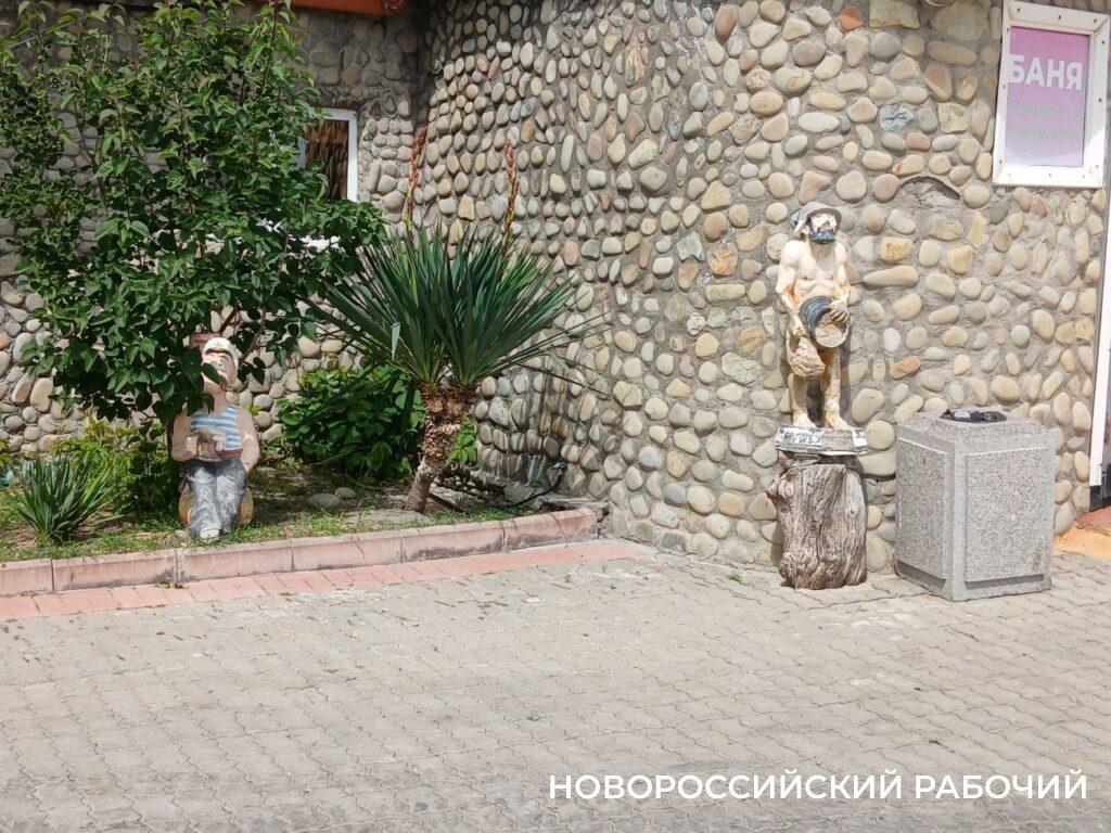 Вообще скульптуры «На мысе» — это нечто особенное. Рядом с распаренным мужичком в кустах спрятался другой – «морской волк» в тельняшке. Среди зонтиков на гальке выставлена скульптура, представляющая стаю дельфинов на волнах. Под ней табличка с надписью «Дельфиний заповедник. Дельфины — люди моря, вестники счастья».