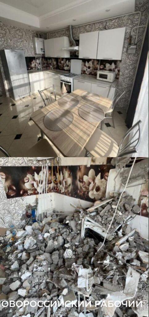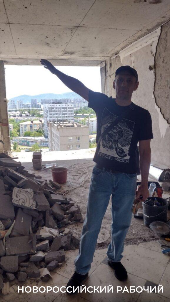 В чем же суть претензий жильцов пострадавших квартир? Об этом мне обстоятельно рассказал Сергей Михалёв из квартиры №135, расположенной на 6 этаже этого дома. Самая главная претензия — прошло 20 дней (встреча состоялась вчера) и ничего не сделало. Мужчина кивает на дом на Мысхакском шоссе, тоже сильно пострадавший от беспилотника (он там был четыре дня назад). Там уже практически все отремонтировано! Там интенсивно работает бригада, закрывает пострадавшие проемы блоками.