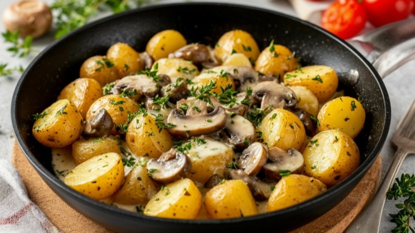 Продукты: сливочное масло— 100 г, растительное масло — 100 мл, чеснок — 1 головка, сливки — 100 мл, шампиньоны — 10 штук, молодой картофель -1 кг, соль по вкусу, зелень.