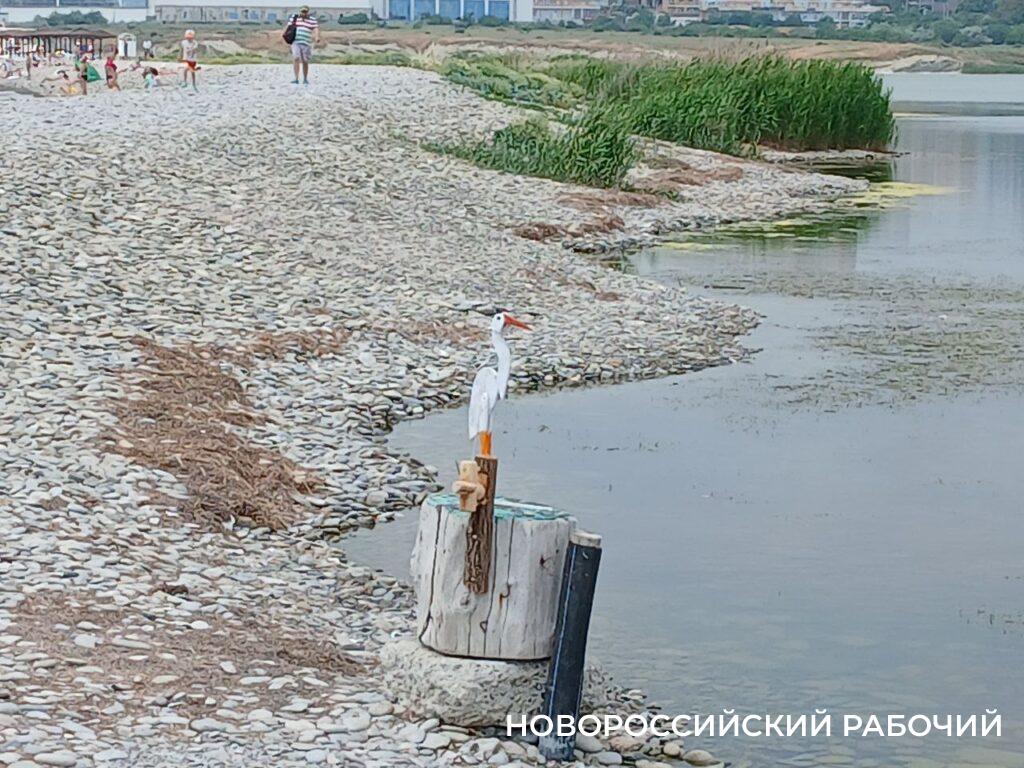 Новороссийцы, привыкшие гулять по Суджукской косе, не так давно увидели на берегу лагуны деревянного аиста. Хотя некоторые утверждают, что скульптура больше напоминает цаплю.