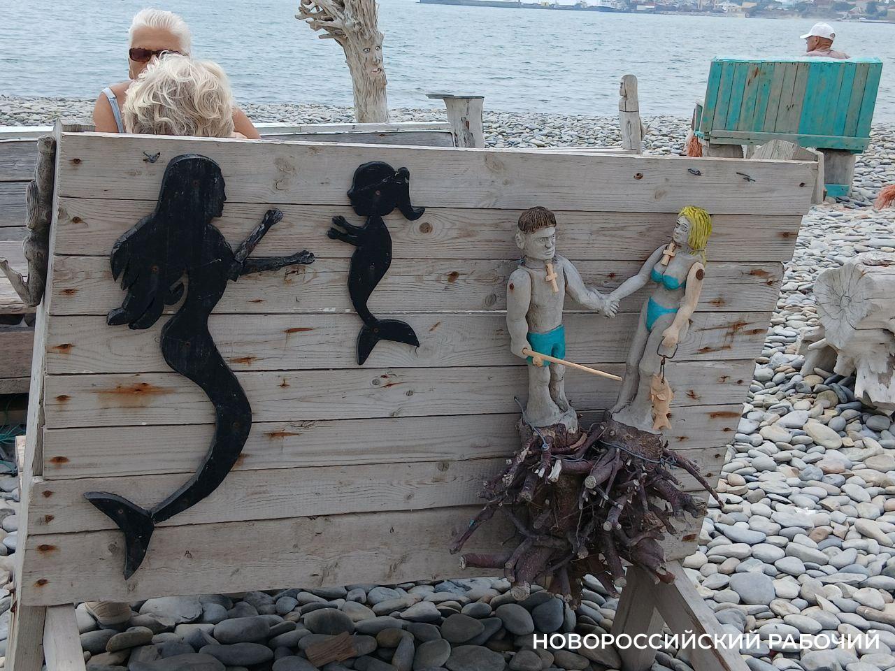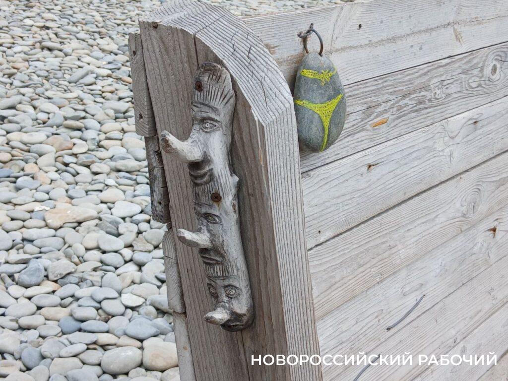 Тут сплошной микс. Тигр, бычок, дракон и некоторые другие персонажи связаны с символами Восточного календаря. Флюгер на высоком стержне. Удивительным образом куски древесины, обработанной морем и солнцем, превращаются в характерные лица. Разгневанные, удивленные, немного легкомысленные. Много сценок из жизни отдыхающих, дорвавшихся до моря, солнца и легкого флирта. Очень выразительны деревянные фигурки в плавках и купальниках. Камни голыши превращены в «тушки» курортниц.