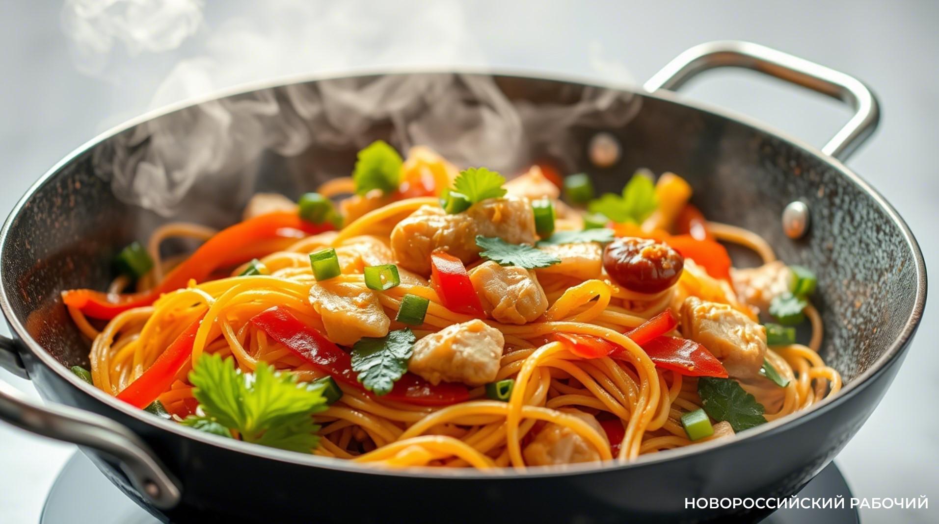 Приготовление: нарежьте курицу полосками, овощи — соломкой, отварите лапшу до полуготовности.