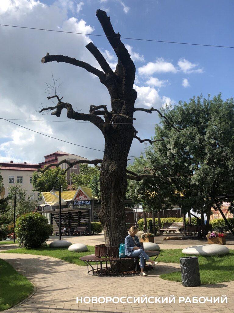 Здесь много тени – старые деревья при реконструкции остались нетронутыми и вот – прекрасный результат. Только одно омрачает впечатление – огромный скелет мертвого дерева практически в центре сквера. В свое время его огородили, оборудовали вокруг скамейки, но обкорнали стволовые ветки так, что сил восстановиться не хватило.