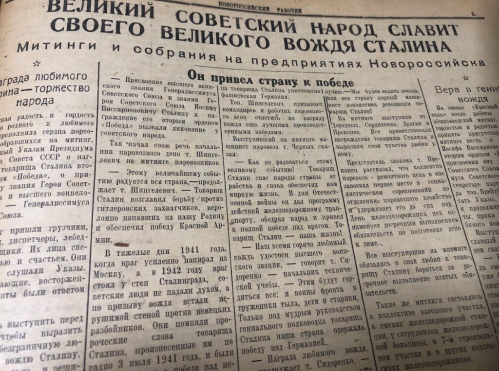Огромная радость и гордость за своего родного и любимого вождя переполнила сердца портовиков, собравшихся на митинге, посвящённом указам Президиума Верховного Совета СССР о награждении товарища Сталина вторым орденом «Победа», о присвоении ему звания Героя Советского Союза и высшего воинского звания Генералиссимуса Советского Союза.