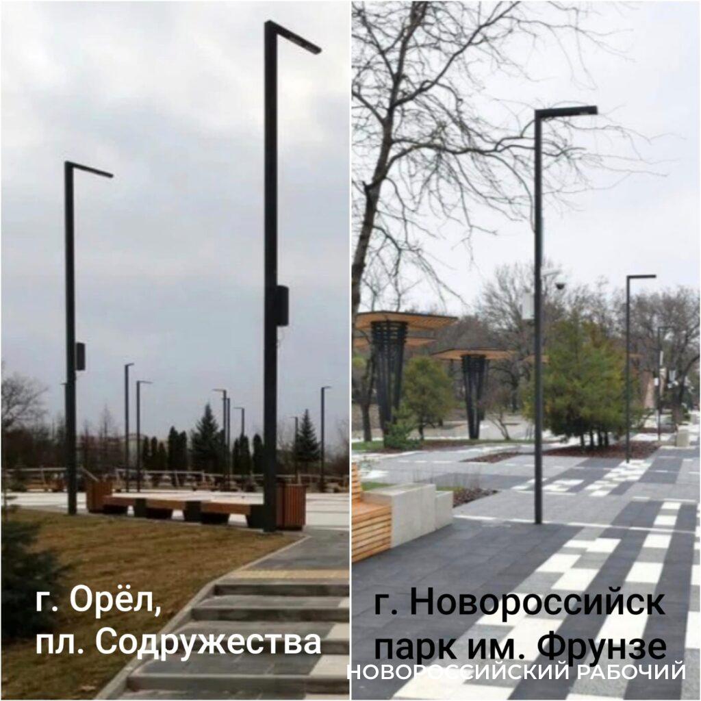 Кстати, Новороссийск, оказывается, просто в тренде! У нас в парке Фрунзе фонари такие же «висельные», как и на пл. Содружества в г. Орел. Орловцы считают их ужасными и не понимают, как комиссия могла принять такое убожество. Хотя при этом признают, что сами фонари — добротные и антивандальные (ну, а какими же еще должны быть виселицы? Шутка).